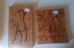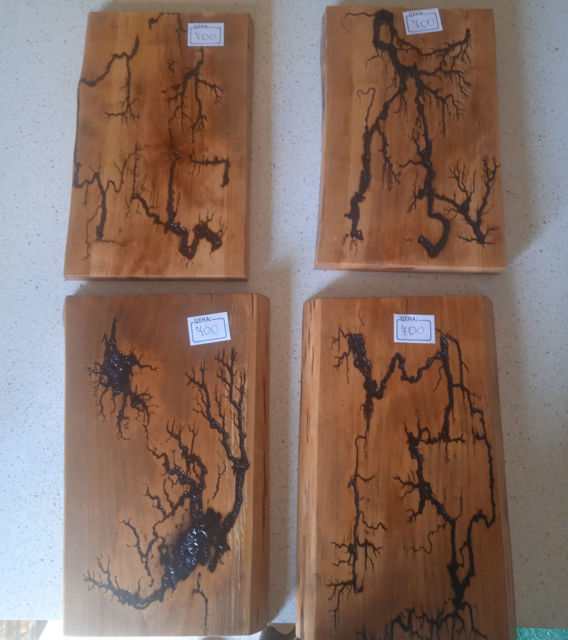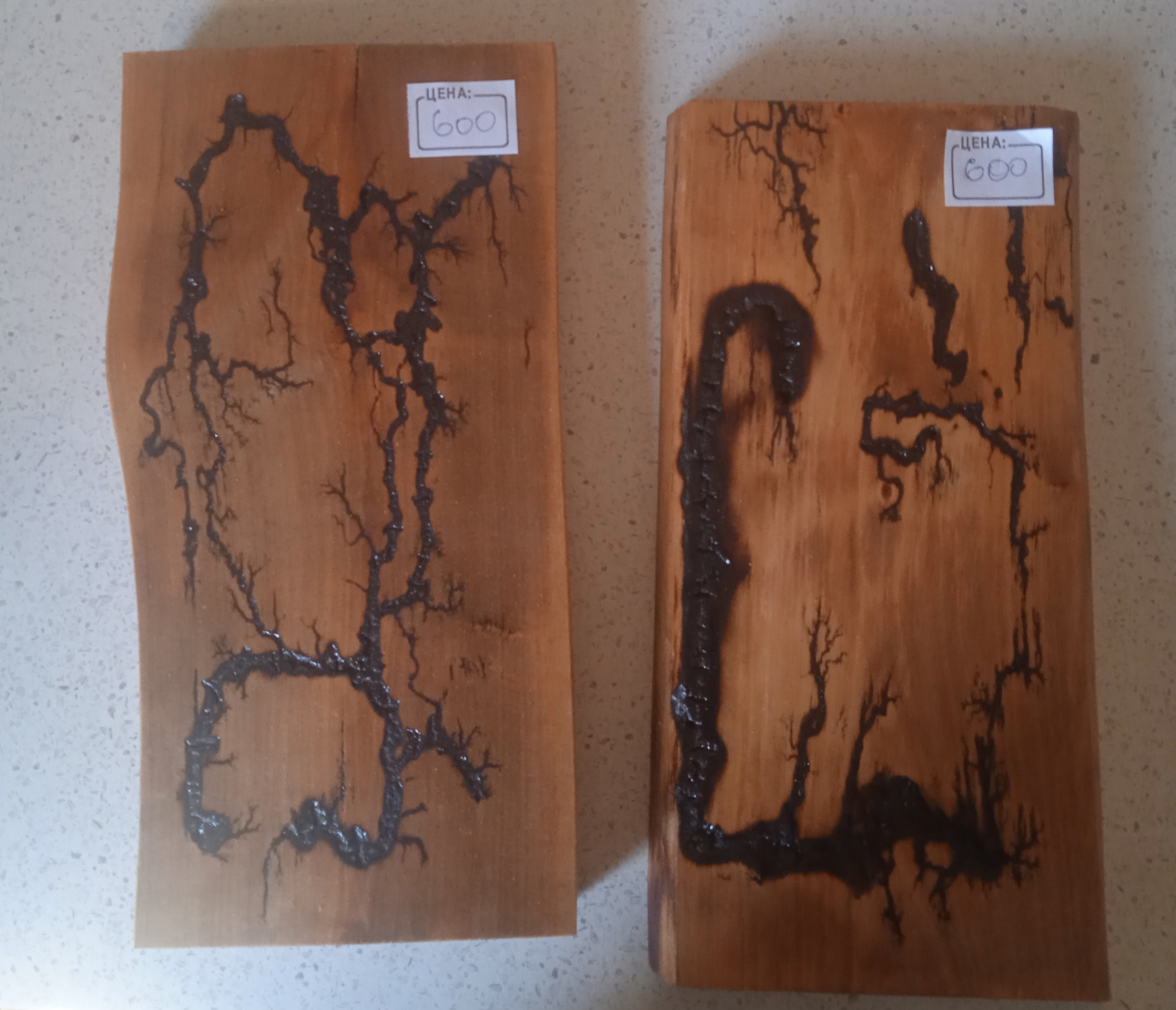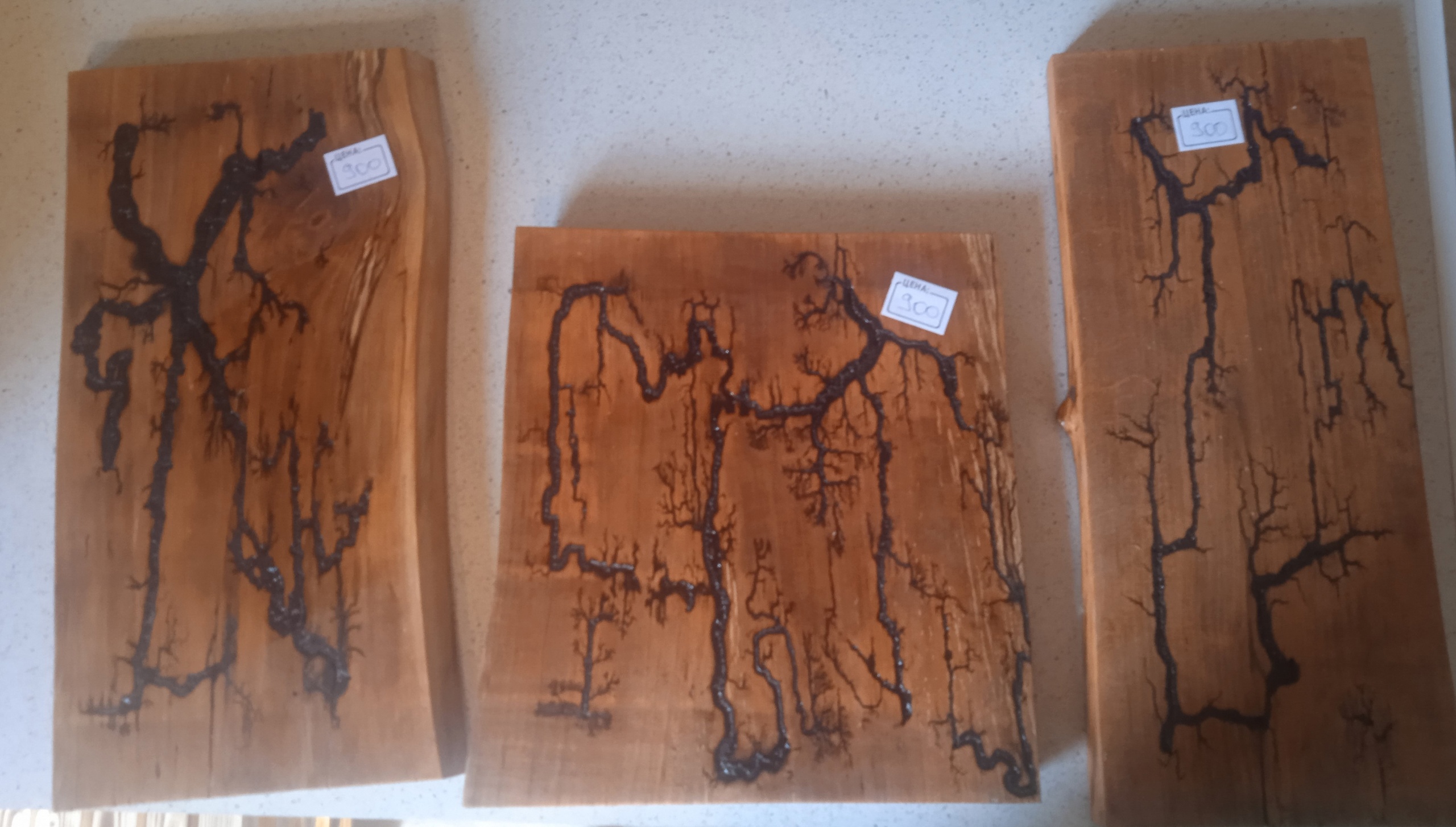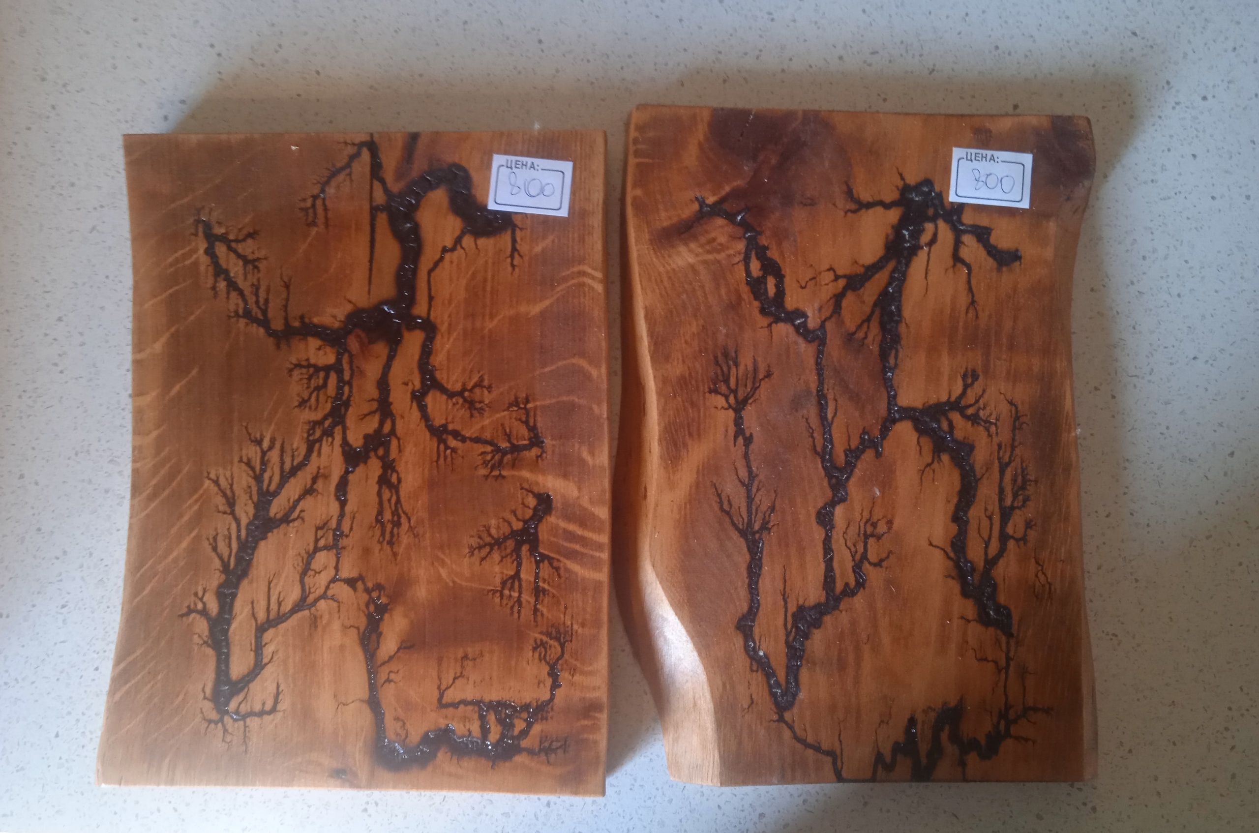 Кухонные доски из дерева с уникальными узорами, выполненные в технике выжигания. Каждая доска имеет свой неповторимый рисунок. Доски различного размера, подходят для нарезки продуктов и сервировки. Цена за штуку варьируется от 600 до 900 рублей. Отличное дополнение для любой кухни, сочетающее практичность и оригинальный дизайн.